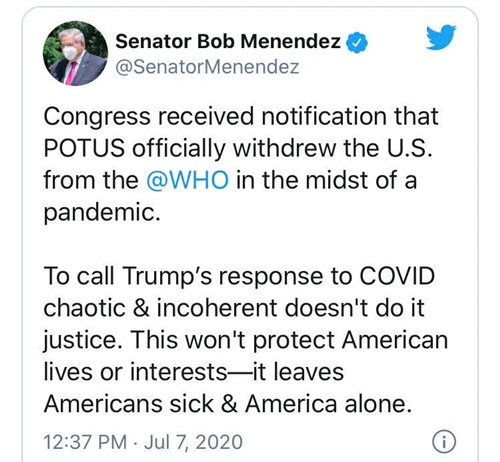 “國會(huì)收到通知,美國總統(tǒng)在全球疫情大流行期間,正式將美國從世衛(wèi)組織中撤出。”美國國會(huì)參議院外交關(guān)系委員會(huì)成員羅伯特·梅嫩德斯7月7日則稱,特朗普在新冠疫情應(yīng)對(duì)中表現(xiàn)出“混亂和前后不一”,退出世衛(wèi)組織的舉動(dòng)“不會(huì)保護(hù)美國人民的生命或利益,而是使美國人生病,使美國孤立無援”。