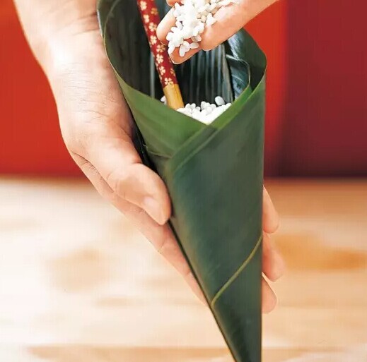 ?雙手捏住粽葉兩端,同時向內(nèi)交叉重疊,折成漏斗形,然后將內(nèi)側(cè)的粽葉在漏斗內(nèi)旋轉(zhuǎn)1圈,再回到原來的位置,使漏斗變成圓錐形。
