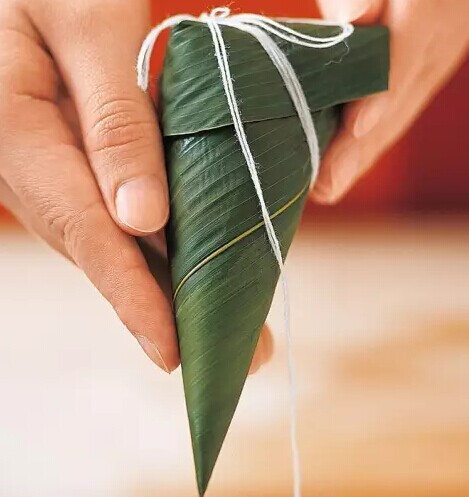 ?用繩子環(huán)繞粽子四面數(shù)圈,將粽子緊緊裹住,并在粽腰處扎緊打結(jié)。(此步驟非常重要,如果繩子捆得不夠結(jié)實(shí),在煮制過程中粽葉會有松開的可能,這樣就前功盡棄了)