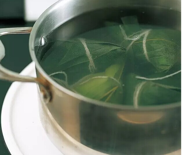 如果沒有鮮品,干葉也可以,不過香味就略遜一籌。將曬干的粽葉,買回來放在溫水里泡,用刷子把葉子的兩邊都刷一遍,再過涼水,反復(fù)數(shù)次,粽葉才算洗干凈,放在水里一直泡到要用時拿起來,攤平,稍稍晾干。用不完的粽葉可以曬干保存。