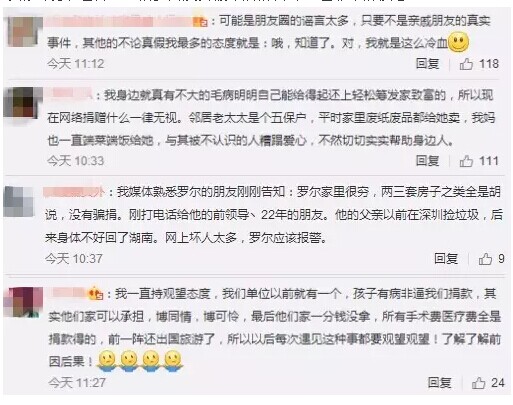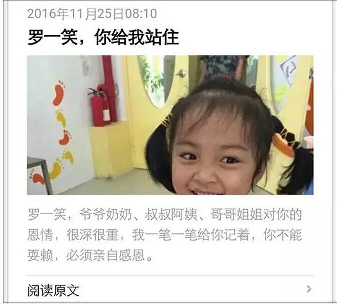 23 日,笑笑病危,住進重癥監(jiān)護室。每天上萬的花費讓羅爾第一次感到了恐慌。經(jīng)過反復思考,羅爾最終選擇了網(wǎng)絡籌款的方式。于是有了這篇名為《羅一笑,你給我站住》的文章,開始占據(jù)朋友圈。