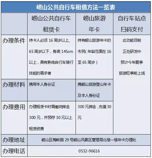 注:持嶗山登山年卡的市民,在辦理并預(yù)存過金額之后,使用公共自行車時(shí)可享受5小時(shí)內(nèi)免費(fèi)的優(yōu)惠政策,5小時(shí)后,按普通自行車租賃卡的收費(fèi)標(biāo)準(zhǔn)計(jì)費(fèi)。