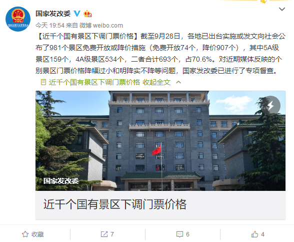 從國(guó)家發(fā)改委獲悉,截至9月28日,各地已出臺(tái)實(shí)施或發(fā)文向社會(huì)公布了981個(gè)景區(qū)免費(fèi)開(kāi)放或降價(jià)措施(免費(fèi)開(kāi)放74個(gè),降價(jià)907個(gè)),其中5A級(jí)景區(qū)159個(gè),4A級(jí)景區(qū)534個(gè),二者合計(jì)693個(gè),占70.6%。