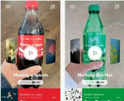不過(guò)最近 ,可口可樂(lè)又放大招,和流媒體音樂(lè)平臺(tái)Spotify合作以AR技術(shù)打造喝可樂(lè)聽音樂(lè)的科技感享受。用戶通過(guò)專有App掃描瓶身就能聽到189種Spotify列表上的音樂(lè),扭轉(zhuǎn)瓶身還能調(diào)解音樂(lè)播放順序。在技術(shù)浪潮推動(dòng)下,不知道又要有多少飲料搭肩黑科技刷新體驗(yàn),看來(lái)值得期待。