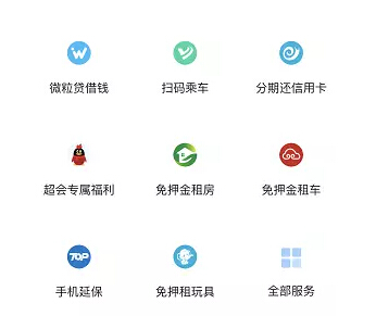 微粒貸借錢、掃碼乘車、分期還信用卡、超會專屬福利、免押金租房、免押騎摩拜、免押金租車、手機延保等眾多服務(wù)。